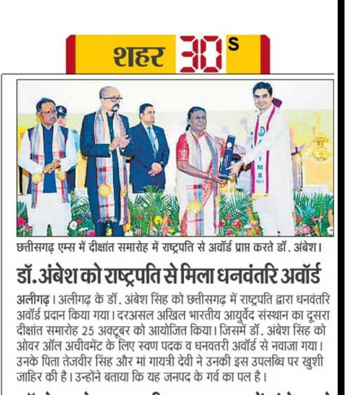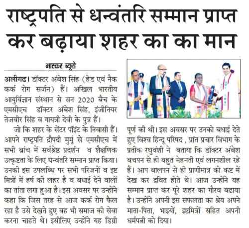Dr. Ambesh Singh is an award-winning Head & Neck Surgical Oncologist,received DHANWANTARI AWARD from the Hounourable President of India for Academic & overall Excellence. Dr.Singh has become a leading expert in the diagnosis, treatment, and surgical management of head and neck cancers, offering innovative approaches that improve patient outcomes and quality of life. He has been at the forefront of oncological surgery, specializing in complex procedures involving the head and neck region. Combining clinical expertise with cutting-edge research, Dr.Ambesh Singh has made significant strides in advancing surgical techniques, particularly in the realms of minimally invasive surgeries, reconstructive surgery, and personalized cancer treatments. In addition to clinical excellence, he is deeply committed to educating and mentoring the next generation of medical professionals, while also contributing to national and international medical conferences, research publications, and training programs. The recognition by the President of India is a testament to Dr.Ambesh Singh's unwavering dedication to improving patient care, pushing the boundaries of medical science, and contributing to the field of oncology. Dr. Singh is a member of several professional organizations, including the Indian Medical Association. His social and humanitarian activities include serving as a COVID-19 warrior, providing care to patients, and participating in medical camps in remote areas.